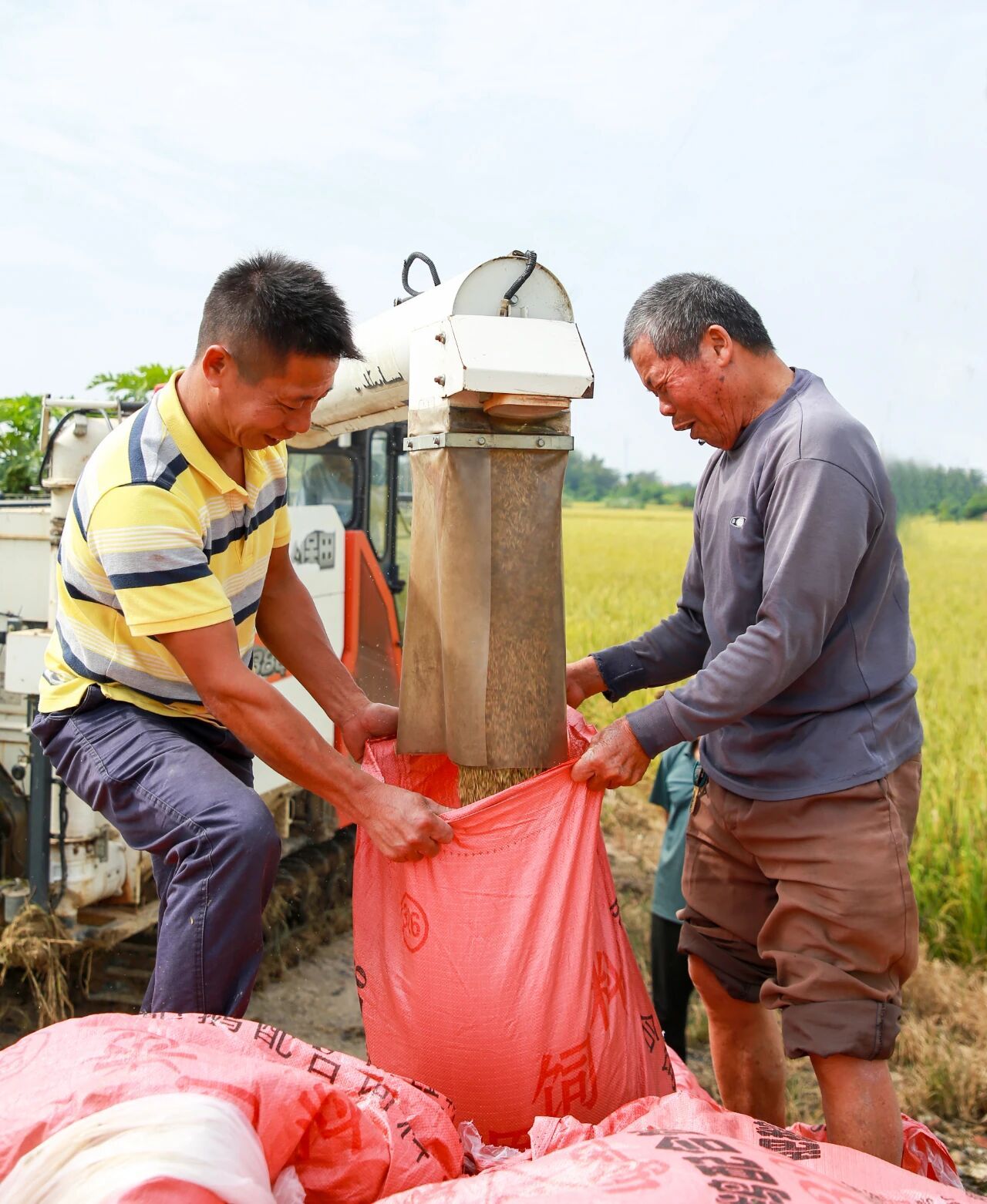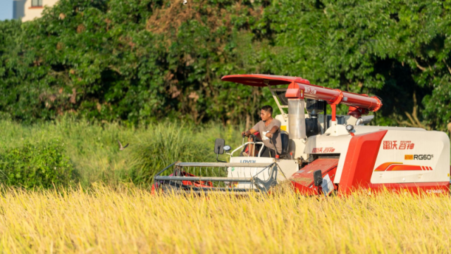 在茂名电白,当地农户通过机械作业抢收秋粮。